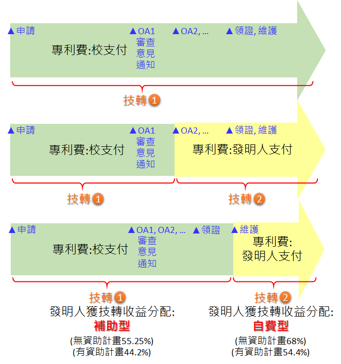 - 獲專利案申請費補助之研發成果,發明人需同意日後如有技轉,權益收入之分配比例依技轉簽約前之最近一次專利費用負擔方式,歸納適用於本校研發成果管理辦法第八條的哪一種規則。若該專利屬於獲校方優化補助期間,該技轉合約之收入依「專案核准本校補助全部專利費用」之比例進行分配;若該專利已因未通過優化評選或發明人已直接改為自費負擔,該技轉合約之收入依「發明人負擔全部專利費用」之比例進行分配。如下圖所示: